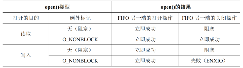 上面的值可以取 OR 运算指定，这些权限会按进程的 umask 值来取掩码。具有合适权限的任何进程都可以打开 FIFO。 一旦创建好 FIFO 后，就可以像一个普通文件一样打开它，然后与管道一样操作它。打开一个 FIFO 时需要为其设置一个读取进程与写入进程。在默认情况下，打开一个 FIFO 读取数据（open 函数 O\_RDONLY 标记）将会阻塞直到另一个进程打开 FIFO 以写入数据（open 函数 O\_WRONLY 标记）。如果想取消此阻塞，则在 open 调用中添加 O\_NOBLOCK 标记。